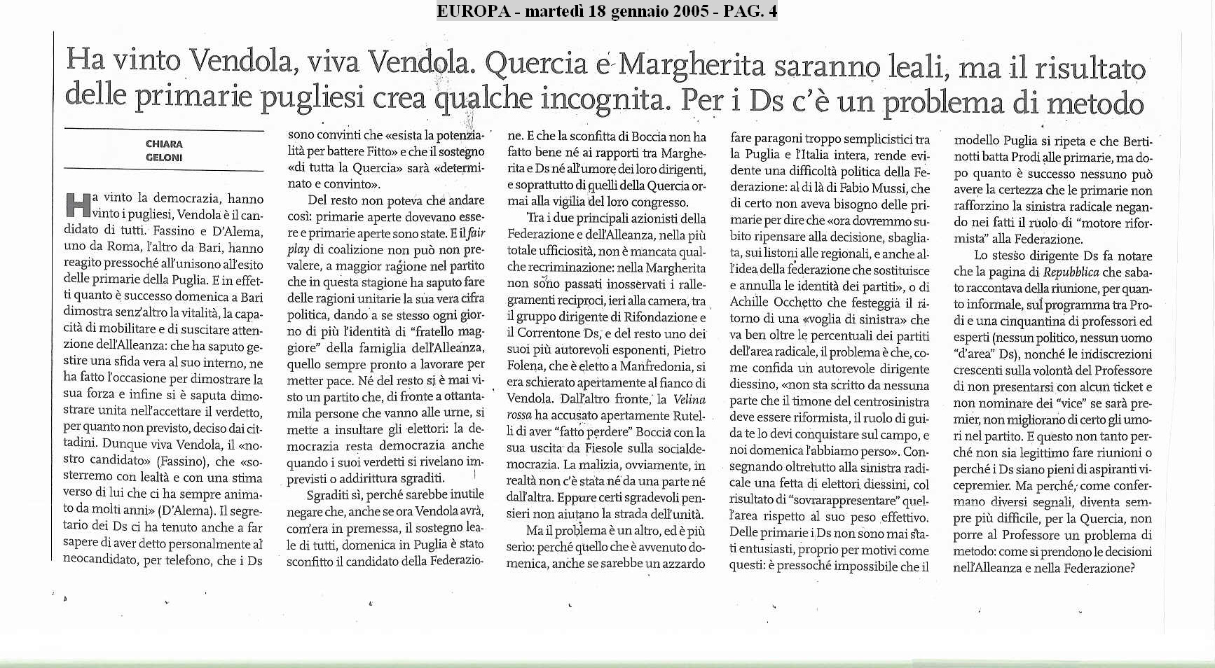 Ha vinto Vendola, viva Vendola. Quercia e Margherita saranno leali, ma il risultato delle primarie pugliesi crea qualche incognita. Per i Ds c’è un problema di metodo di CHIARA GELONI Ha vinto la democrazia, hanno vinto i pugliesi, Vendola è il candidato di tutti. Fassino e D’Alema, uno da Roma, l’altro da Bari, hanno reagito pressoché all’unisono all’esito delle primarie della Puglia. E in effetti quanto è successo domenica a Bari dimostra senz’altro la vitalità, la capacità di mobilitare e di suscitare attenzione dell’Alleanza: che ha saputo gestire una sfida vera al suo interno, ne ha fatto l’occasione per dimostrare la sua forza e infine si è saputa dimostrare unita nell’accettare il verdetto, per quanto non previsto, deciso dai cittadini. Dunque viva Vendola, il «nostro candidato» (Fassino), che «sosterremo con lealtà e con una stima verso di lui che ci ha sempre animato da molti anni» (D’Alema). Il segretario dei Ds ci ha tenuto anche a far sapere di aver detto personalmente al neocandidato, per telefono, che i Ds sono convinti che «esista la potenzialità per battere Fitto» e che il sostegno «di tutta la Quercia» sarà «determinato e convinto». Del resto non poteva che andare così: primarie aperte dovevano essere e primarie aperte sono state. E il fair play di coalizione non può non prevalere, a maggior ragione nel partito che in questa stagione ha saputo fare delle ragioni unitarie la sua vera cifra politica, dando a se stesso ogni giorno di più l’identità di “fratello maggiore” della famiglia dell’Alleanza, quello sempre pronto a lavorare per metter pace. Né del resto si è mai visto un partito che, di fronte a ottantamila persone che vanno alle urne, si mette a insultare gli elettori: la democrazia resta democrazia anche quando i suoi verdetti si rivelano imprevisti o addirittura sgraditi. Sgraditi sì, perché sarebbe inutile negare che, anche se ora Vendola avrà, com’era in premessa, il sostegno leale di tutti, domenica in Puglia è stato sconfitto il candidato della Federazione. E che la sconfitta di Boccia non ha fatto bene né ai rapporti tra Margherita e Ds né all’umore dei loro dirigenti, e soprattutto di quelli della Quercia ormai alla vigilia del loro congresso. Tra i due principali azionisti della Federazione e dell’Alleanza, nella più totale ufficiosità, non è mancata qualche recriminazione: nella Margherita non sono passati inosservati i rallegramenti reciproci, ieri alla camera, tra il gruppo dirigente di Rifondazione e il Correntone Ds, e del resto uno dei suoi più autorevoli esponenti, Pietro Folena, che è eletto a Manfredonia, si era schierato apertamente al fianco di Vendola. Dall’altro fronte, la Velina rossa ha accusato apertamente Rutelli di aver “fatto perdere” Boccia con la sua uscita da Fiesole sulla socialdemocrazia. La malizia, ovviamente, in realtà non c’è stata né da una parte né dall’altra. Eppure certi sgradevoli pensieri non aiutano la strada dell’unità. Ma il problema è un altro, ed è più serio: perché quello che è avvenuto domenica, anche se sarebbe un azzardo fare paragoni troppo semplicistici tra la Puglia e l’Italia intera, rende evidente una difficoltà politica della Federazione: al di là di Fabio Mussi, che di certo non aveva bisogno delle primarie per dire che «ora dovremmo subito ripensare alla decisione, sbagliata, sui listoni alle regionali, e anche all’idea della federazione che sostituisce e annulla le identità dei partiti», o di Achille Occhetto che festeggia il ritorno di una «voglia di sinistra» che va ben oltre le percentuali dei partiti dell’area radicale, il Problema è che, come confida un autorevole dirigente diessino, «non sta scritto da nessuna parte che il timone del centrosinistra deve essere riformista, il ruolo di guida te lo devi conquistare sul campo, e noi domenica l’abbiamo perso». Consegnando oltretutto alla sinistra radicale una fetta di elettori diessini, col risultato di “sovrarappresentare” quell’area rispetto al suo peso effettivo. Delle primarie i Ds non sono mai stati entusiasti, proprio per motivi come questi: è pressoché impossibile che il modello Puglia si ripeta e che Bertinotti batta Prodi alle primarie, ma dopo quanto è successo nessuno può avere la certezza che le primarie non rafforzino la sinistra radicale negando nei fatti il ruolo di “motore riformista” alla Federazione. Lo stesso dirigente Ds fa notare che la pagina di Repubblica che sabato raccontava della riunione, per quanto informale, sul programma tra Prodi e una cinquantina di professori ed esperti (nessun politico, nessun uomo “d’area” Ds), nonché le indiscrezioni crescenti sulla volontà del Professore di non presentarsi con alcun ticket e non nominare dei “vice” se sarà premier, non migliorano di certo gli umori nel partito. E questo non tanto perché non sia legittimo fare riunioni o perché i Ds siano pieni di aspiranti vicepremier. Ma perché, come confermano diversi segnali, diventa sempre più difficile, per la Quercia, non porre al Professore un problema di metodo: come si prendono le decisioni nell’Alleanza e nella Federazione?